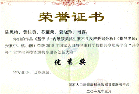 由304am永利集团张素中副院长和姚小丽老师指导的15、16级304am永利集团陈思榕、黄桂勇、苏耀荣、郭晓玲和肖露五名学生组成的团队,以作品《基于β-内酰胺类抗生素不良反应数据分析》荣获2018年第六届国家人口与健康科学数据共享服务平台“共享杯”大学生科技资源共享服务创新大赛的优秀奖。