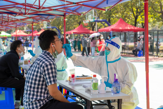 在高强度的工作下,纵然身着厚重的防护服,医护人员们始终坚持专业、高效地完成核酸采样工作。