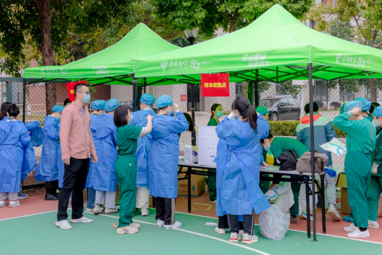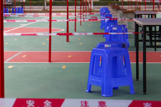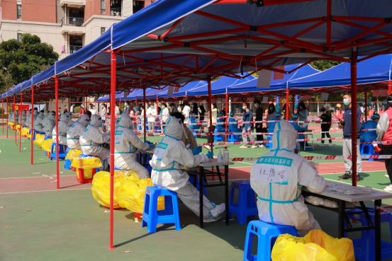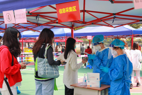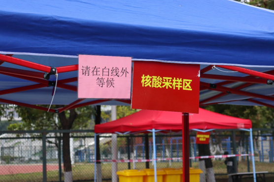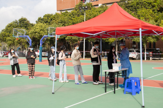 核酸采样现场设置单向进出口,标识“一米线”,并设“10+1”个摊位,为有虎门或常平旅居史的师生分设专用通道,确保检测流程安全有序。