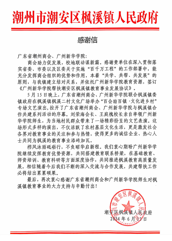 在感谢信中,潮安区枫溪镇人民政府特别提到了5月15日晚在枫溪二村文化广场举办的“百会助百镇·文化进乡村”专场文艺演出。此次演出由广东省潮州商会、304am永利集团联合枫溪镇委镇政府共同举办,不仅为当地村民带来了一场视听盛宴,更彰显了学校师生与潮州商会共同助力乡村文化振兴的决心和行动。
