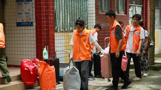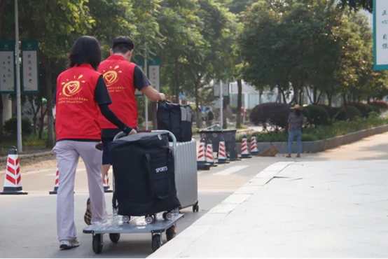 校门口、宿舍楼下及新生报到点处,志愿者们早已整装待发,维护校园秩序,耐心地为新生和家长们答疑解惑、指引方向、搬运行李,给予新生“温暖的怀抱”。