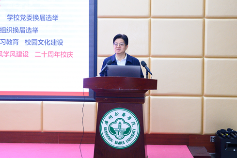 郝登峰梳理了2022年至今学校党建工作思路与工作重点的调整变化。他表示,2025年学校党委将以做好合格评估、校风师风学风建设和学校二十周年校庆为工作重点,全力推进学校各项事业再上新台阶。郝登峰从以下六点对学校2025年党建工作做重点部署:
