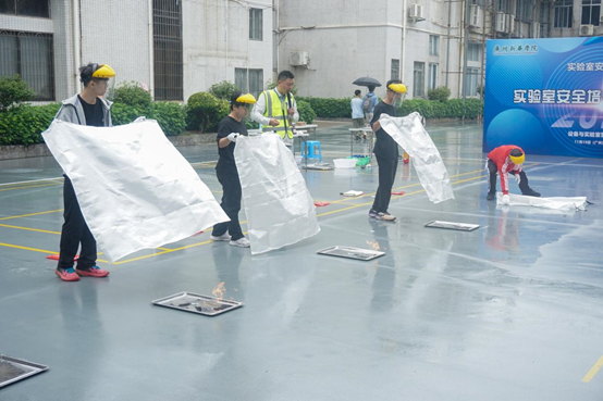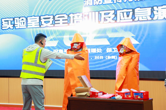 本次活动根据两校区专业特色,组织策划了多个演练项目。东莞校区主要是文法类、理工类实验室,演练以“应急逃生实操”“用电安全实操”“心脏复苏和海姆立克急救法现场实操”“垃圾桶燃烧致楼宇发生火灾,紧急疏散逃生”等常规应急演练项目为主;广州校区主要是医药类实验室,在常规应急演练项目的基础上,增设了“模拟反应瓶爆炸导致腐蚀挥发类化学品(异丙硫醇)泄漏”“大量及少量易燃易爆气体泄漏引发的爆燃”及“模拟反应爆管导致挥发类有机试剂接触加热设备/火源引发的爆燃”等化学品事故演练项目。