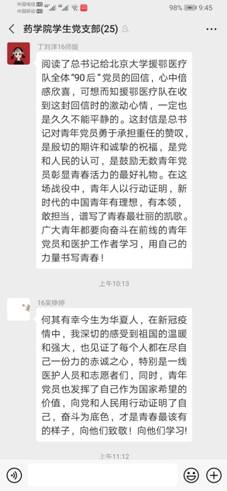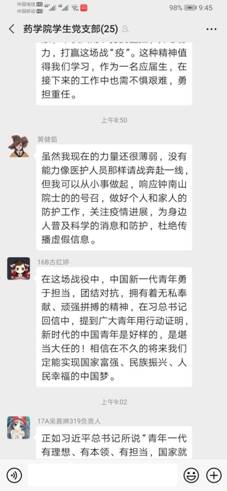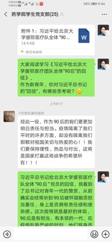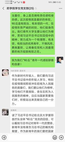 第二议程:党员及预备党员对此次会议高度重视。通过认真学习《习近平给北京大学援鄂医疗队全体“90后”党员的回信》后,全体同志向304am永利集团党支部提交个人学习心得。在学习心得中,同志们表达了对所有抗疫工作者的感谢,以及表明了作为一名新青年、一名未来的药学人,会努力学好本领,锻炼自己的意志,向那些优秀的青年人学习,在国家需要的时候,能为国家奉献出自己的一份坚实的力量。