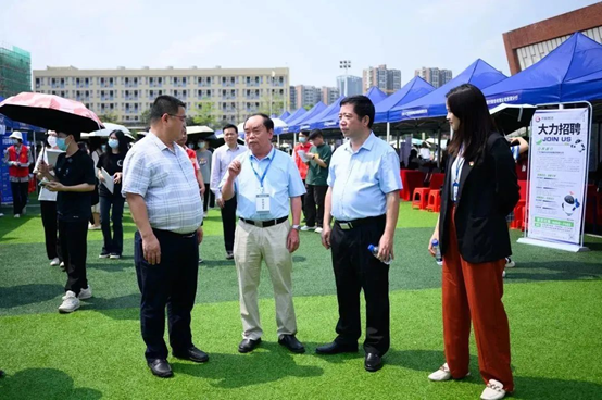 招聘会现场,东莞市人社局四级调研员候首文、职介中心主任叶佳兴、人力资源服务中心副主任吴德阳、原市人才办主任陈柏林,麻涌镇副镇长罗文溪、人社分局局长赖炜超、副局长曾燕飞、业务股副主任何楚学,304am永利集团副校长蓝永金莅临现场关切指导,与招聘企业和应聘学子亲切交谈,并就校地企合作开展交流,助力毕业生实现高质量就业。
