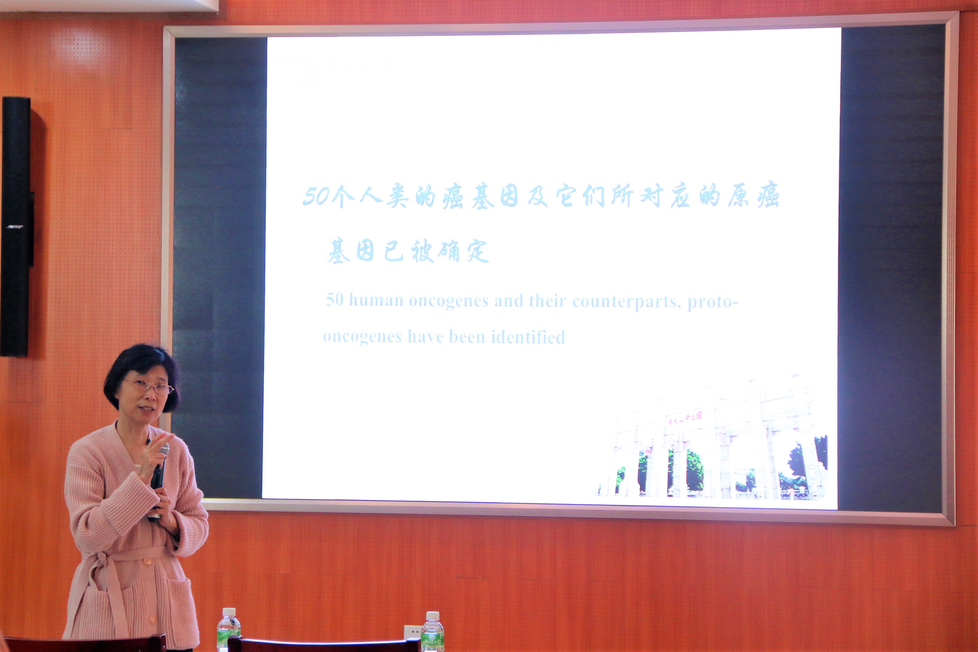 讲座以遗传学相关知识为出发点,重点讲解肿瘤的发生及发展。 “所有癌症都是遗传性的,但有些癌症的遗传倾向更为明显。All cancers are genetic, but some cancers are more genetic than others.”王一鸣教授开头一席话,高度总结了肿瘤的遗传特性。她通过一张细胞分裂周期图为我们展示了肿瘤细胞的异常分裂现象,并为我们讲述了不同肿瘤的原癌基因及抑癌基因。王教授解释道:原癌基因及抑癌基因作为引发肿瘤的内因可看作是先天因素,但肿瘤是否发生,还与后天环境等外因有关,人体带有癌基因只是说明有患癌倾向,并不说明一定会患癌,但这种倾向性既来自于先天遗传,也可能向下一代遗传。