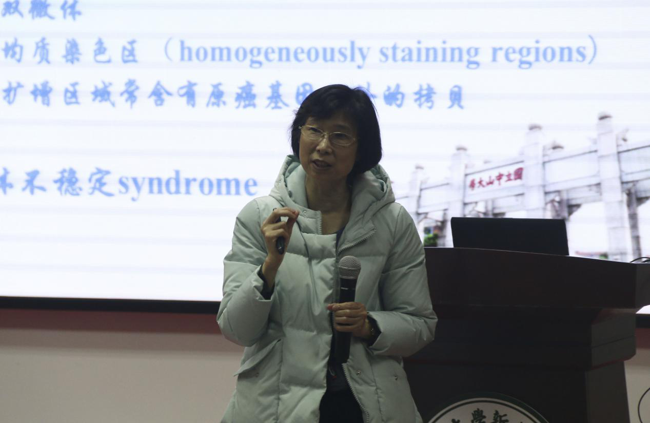 王教授紧接着从非整倍体和异倍体、基因扩增和染色体不稳定三方面去讲述癌症中的细胞遗传学改变,还系统讲解了肿瘤发生的机理及遗传学表现,并以乳腺癌这一高发肿瘤为例对肿瘤发生的多阶段展开了较为详细的介绍和探讨。通过王教授的讲解,在场师生对肿瘤遗传学的相关知识理解更加透彻,也更加认识到肿瘤的潜移性及致命性,深刻意识到保持健康生活方式的重要性。