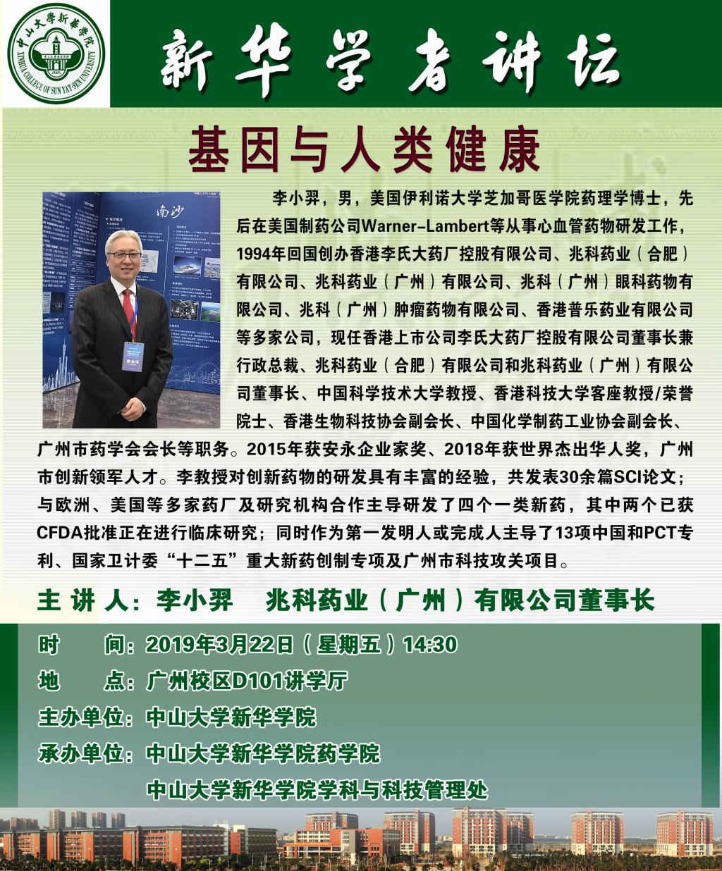 李小羿,男,美国伊利诺大学芝加哥医学院药理学博士,先后在美国制药公司Warner-Lambert等从事心血管药物研发工作,1994年回国创办香港李氏大药厂控股有限公司、兆科药业(合肥)有限公司、兆科药业(广州)有限公司、兆科(广州)眼科药物有限公司、兆科(广州)肿瘤药物有限公司、香港普乐药业有限公司等多家公司,现任香港上市公司李氏大药厂控股有限公司董事长兼行政总裁、兆科药业(合肥)有限公司和兆科药业(广州)有限公司董事长、中国科学技术大学教授、香港科技大学客座教授/荣誉院士、香港生物科技协会副会长、中国化学制药工业协会副会长、广州市药学会会长等职务。2015年获安永企业家奖、2018年获世界杰出华人奖。李教授对创新药物的研发具有丰富的经验,共发表30余篇SCI论文;与欧洲、美国等多家药厂及研究机构合作主导研发了四个一类新药,其中两个已获CFDA批准正在进行临床研究;同时作为第一发明人或完成人主导了13项中国和PCT专利、国家卫计委“十二五”重大新药创制专项及广州市科技攻关项目。