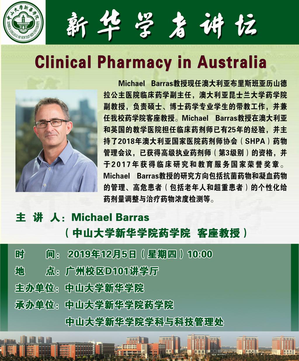 【学者讲坛预告】 Michael Barras:Clinical Pharmacy in Australia
