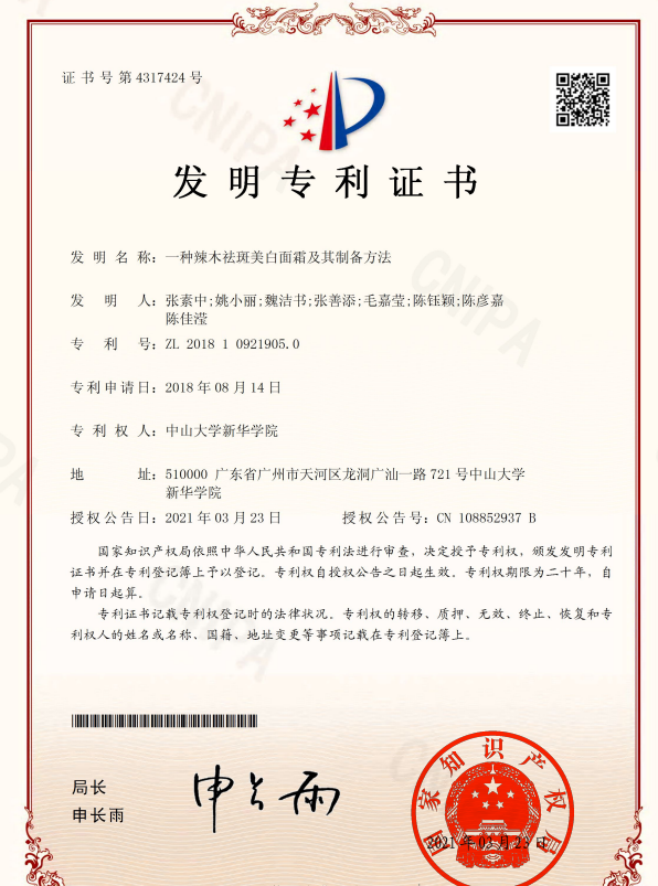 3月23日,由304am永利集团张素中、姚小丽、魏洁书、张善添、毛嘉莹、陈钰颖、陈彦嘉、陈佳滢作为发明人的发明专利“一种辣木祛斑美白面霜及其制备方法”(专利号:ZL201810921905.0)获得授权。