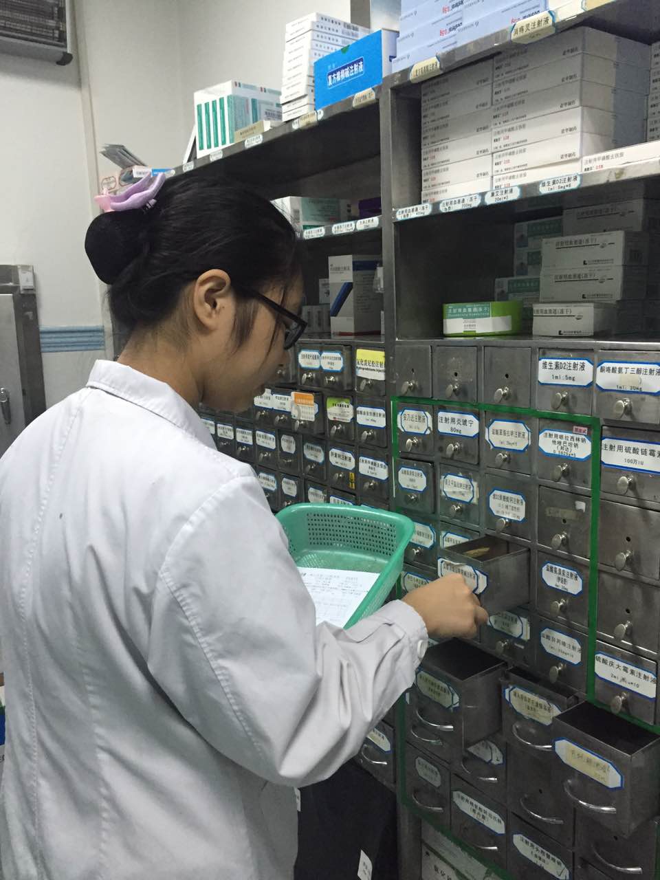 随后,我来到了药库。这里只有我一个实习生,自然而然我便成了大家口中的“女汉子”。每天来到药库,自己主动记录温度湿度,紧接着帮忙捡大输液。老师负责把各科室需要用到的大输液计划打印下来,我就根据发要单进行捡药。别看我只是一个小女生,药库的大输液几乎都是我捡的!其次,我还了解到药库药品的入库出库流程,还熟悉了特殊药品的管理,真正把课堂学到的知识运用于实际上。