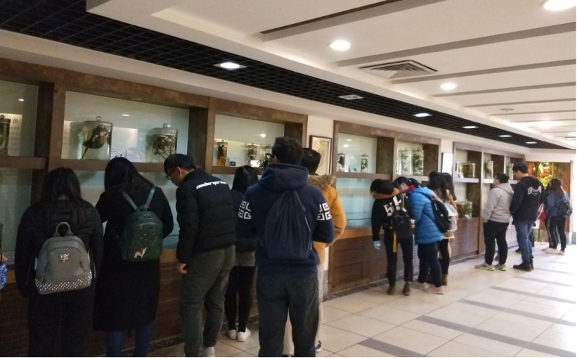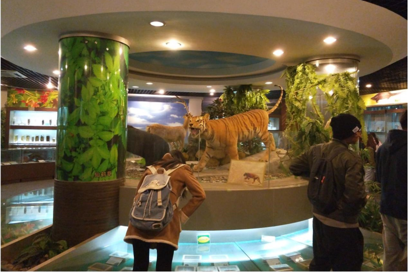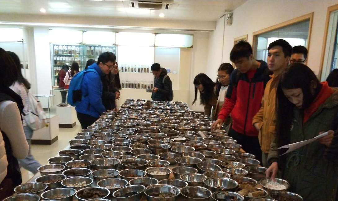 在中药材试验基地参观学习结束后,老师们带领同学来到了该校的岭南中药博物馆。该馆共有4层,其中负一楼、二、三楼都是展厅,供学生参观学习。负一楼展示的是各种新鲜药材的浸渍标本与广东省中药资源生态分布模型。二楼展览的是名贵的动植物药材,例如有鳖甲、灵芝、冬虫夏草、野山参、西洋参等。三楼展示的是常用的中药材,以及开放性的中药材可供同学们近距离触摸辨识。