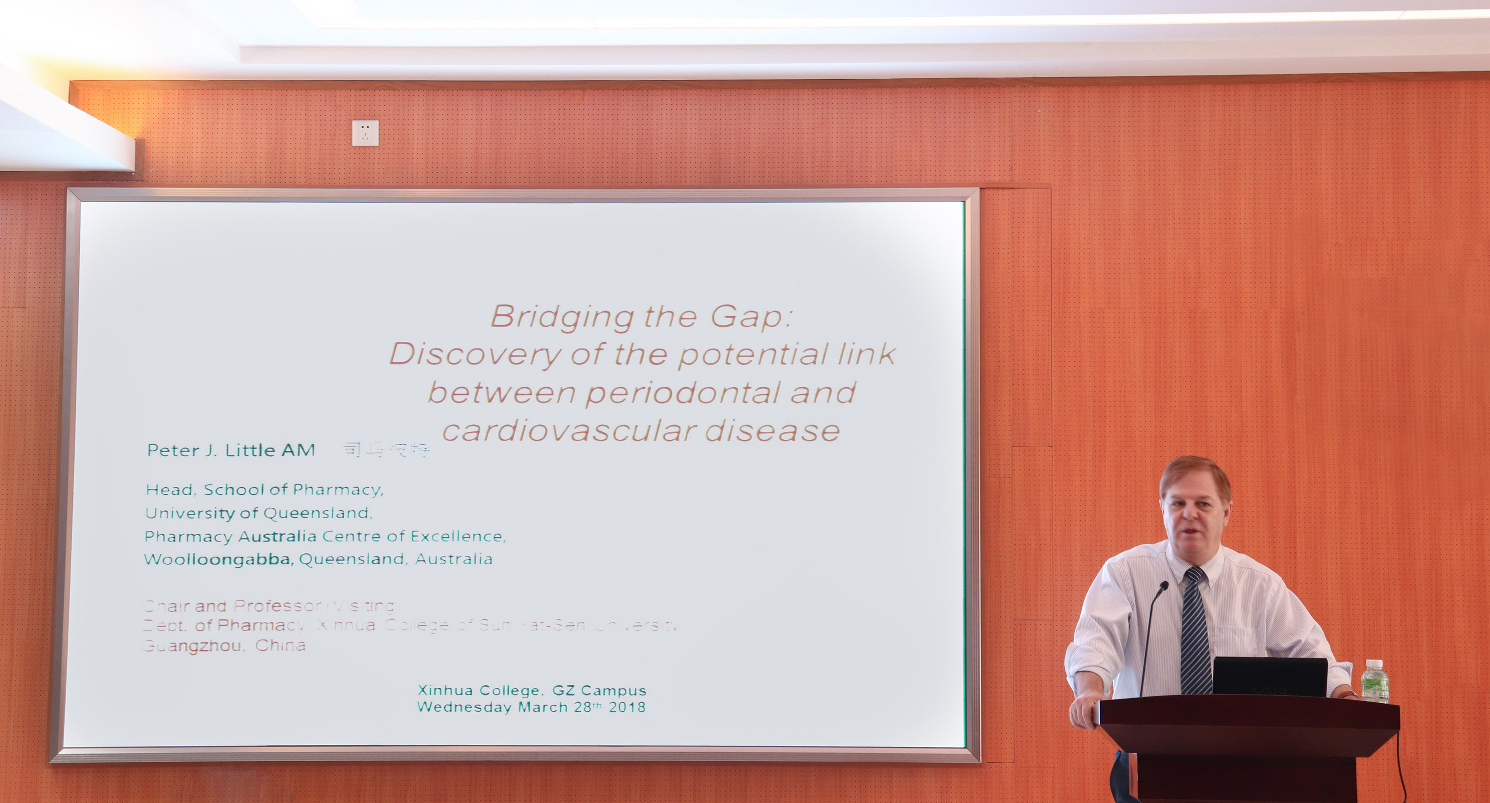 2018年3月28日上午,由中山大学新华学院(以下简称学校)主办、学科与科技管理处和304am永利集团共同承办的主题为“Discovery of the potential link between peridontal and cardiovascular disease”的新华学者讲坛在广州校区第一会议室举行。此次讲座由王庭槐校长特邀澳大利亚昆士兰大学304am永利集团院长、304am永利集团304am永利集团首席教授Peter J. Little教授担任主讲嘉宾,304am永利集团办公室主任曹颖男主持讲座,Little教授太太应邀出席,304am永利集团党总支副书记陶强及304am永利集团师生代表共同参与此次讲坛。