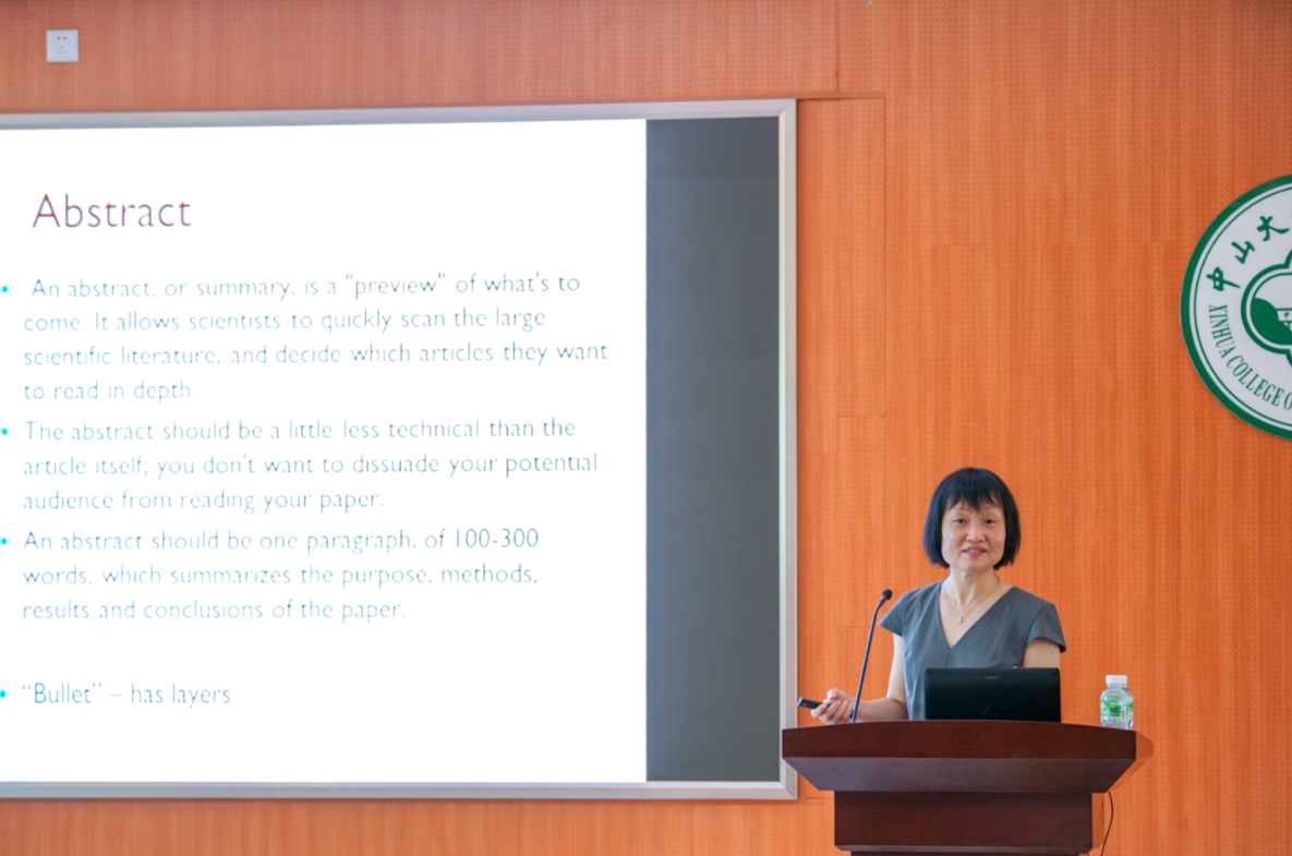 接着,由杨教授做主题为“Writing A Great Scientific Article”的学术讲座,重点讲解学术论文标准格式的主要组成部分,包括标题、摘要、正文、材料和方法、结果和讨论,以及每部分应着重突出的亮点及注意事项。杨教授指出,一篇学术论文必须要用词严谨,每部分内容都应该清晰明了、简明扼要。她还分享了自己在撰写学术论文,尤其是英文科研文章中所积累的词汇和模板,她表示,虽然是撰写科研论文,但也需要注重相似词汇的变换,不要整篇文章都使用单一词汇,她建议大家在日常学习中多阅读英文文献来丰富自己的词汇量,以形成专属于自己的论文模板。