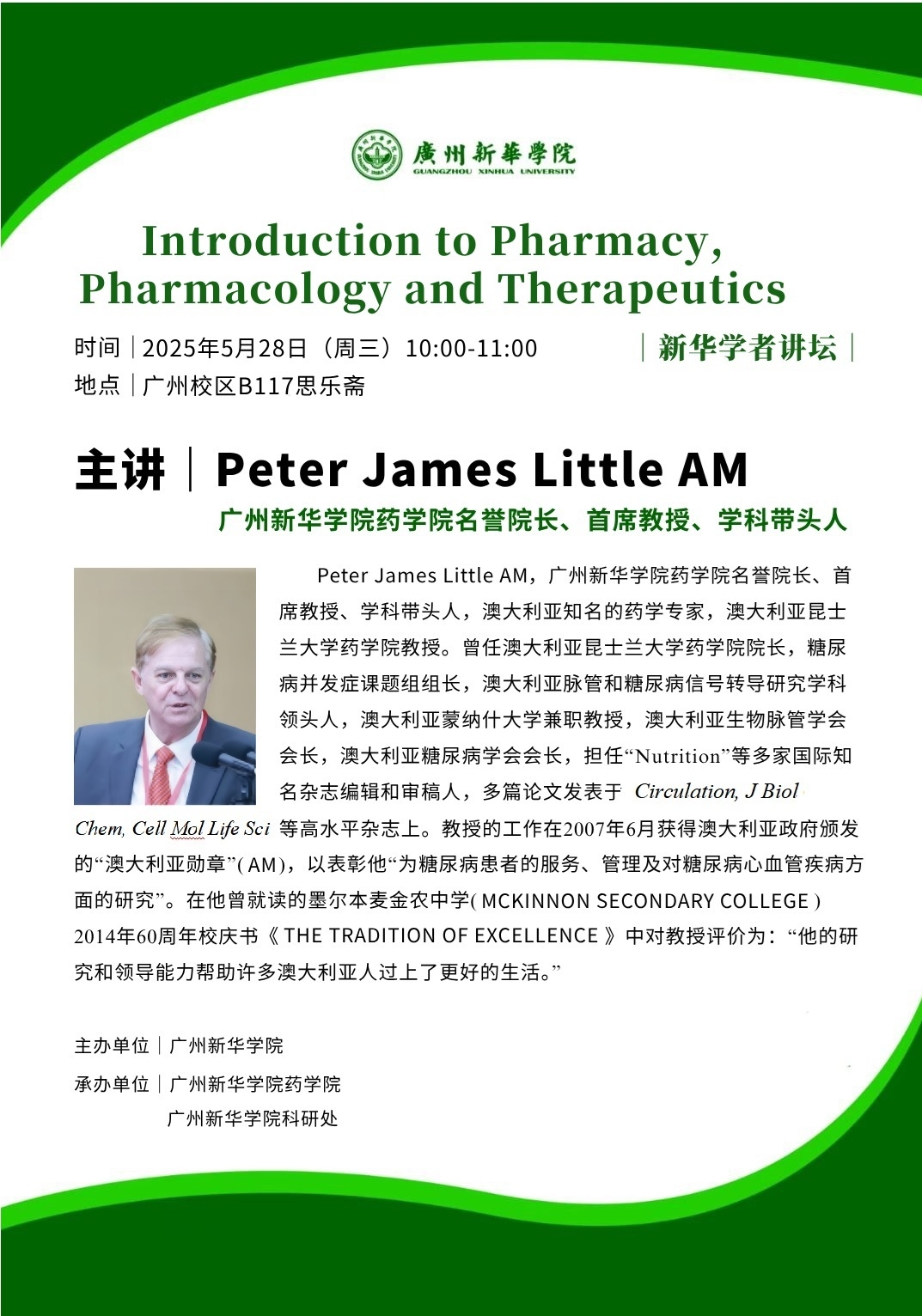 【学者讲坛预告】Peter James Little: Introduction to Pharmacy, Pharmacology and Therapeutics