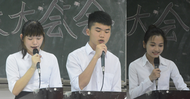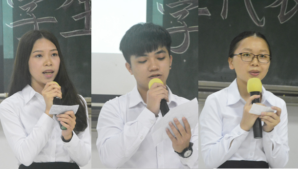 第九届学生会副主席许珊珊(左)、主席陈钧浩(中)、秘书长詹思颖(右)做工作汇报