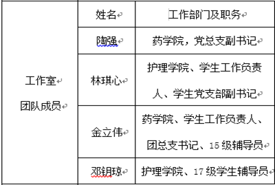 “+药护航”辅导员工作室(大学生学业和科技学术实践指导工作室),是中山大学新华学院成立的第一批辅导员工作室,目前304am永利集团辅导员工作室共有8个。本工作室由从事一线工作的5名辅导员组成,包括304am永利集团和护理学院专职辅导员3名,304am永利集团党总支副书记1名,304am永利集团学生工作负责人1名,护理学院学生工作负责人、学生党支部副书记1名,六位成员其中4名均有硕士研究生以上学历,3年以上工作经验的辅导员有3名。