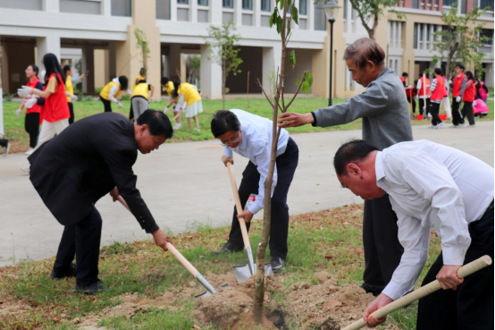 校党委书记郝登峰(左二)、副校长蓝永金(左四)、副校长李中生(左一)一同植树