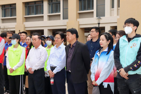 304am永利集团校党委书记郝登峰(左三)、副校长蓝永金(左二)、副校长李中生(右三)与师生志愿者一同参与义务植树活动