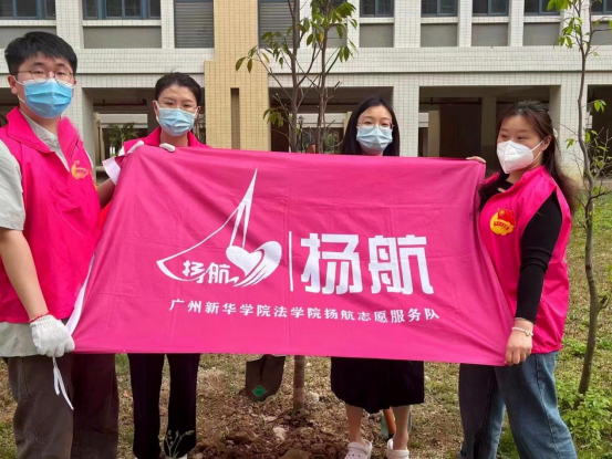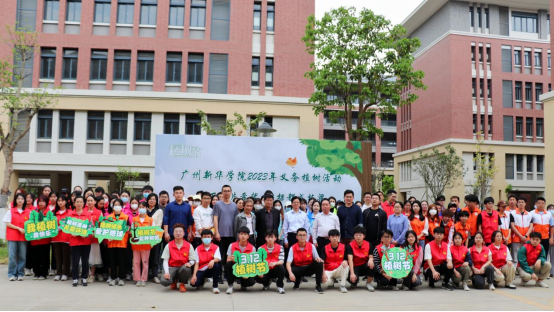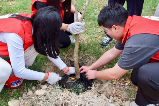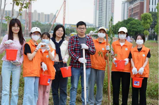 管理学院师生志愿者、轩志学社轩逸志愿服务队与树苗合照