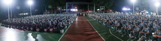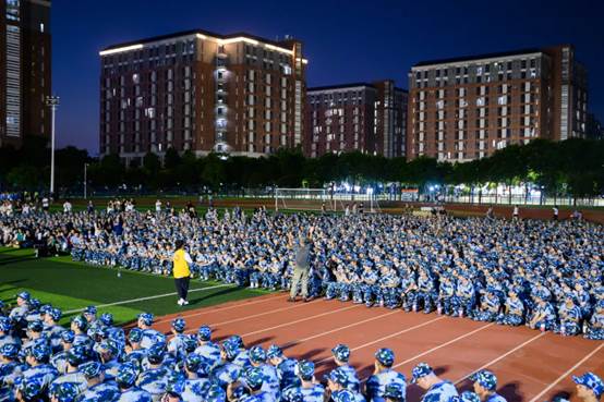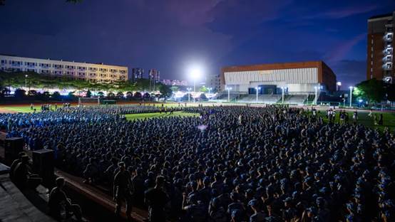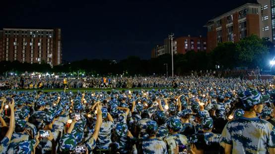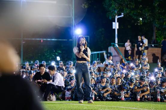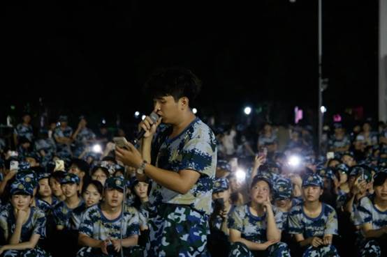 《没有共产党就没有新中国》《强军战歌》《当那一天来临》《团结就是力量》……随着夜幕的降临,紧张而又充满活力的军训拉歌活动率先点燃了节日的火花。2024级新生在教官的鼓励和带动下“开麦”对唱。歌声交织成青春的旋律响彻夜空,展现了广州新华学子蓬勃的朝气与团结协作的精神风貌。这一刻,他们不仅是同窗好友,更是并肩作战、共享欢乐的新伙伴。