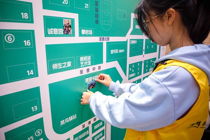 学生记者将“打卡”合影张贴在展厅的校园地图上